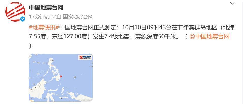 中国地震台网自动测定:中国地震台网正式测定:10月10日09时43分在菲律宾群岛地区(北纬7.55度,东经127.00度)发生7.4级地震,震源深度50千米。